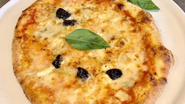 - Sauce tomate, mozza, di bufala, olives noires, origans et basilic frais