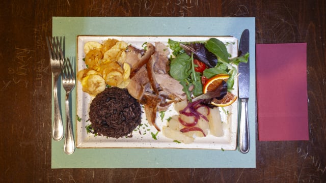 - Carne di maiale marinata e cotta al forno 24 ore con arroz moros yuca e chips di platand