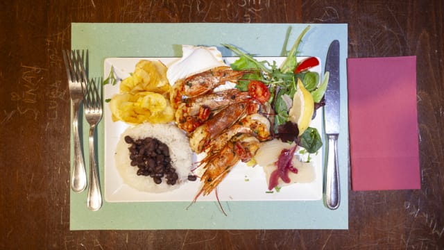 - Gamberoni alla piastra con riso bianco basmati + fagioli neri + yuca + chips di platano