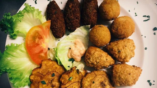 - Polpettine di carne di manzo + chips di platano verde fritto + cubetti di maiale marinati e fritti