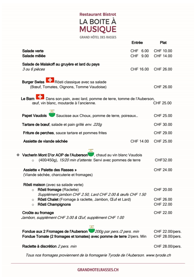 La Boîte à Musique (Grand hôtel des Rasses) is identified as offering european cuisine.