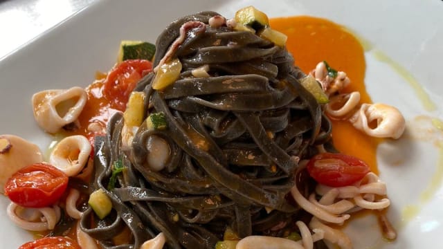 Taglietelle noires aux petits calamars, courgettes & tomates cerises
