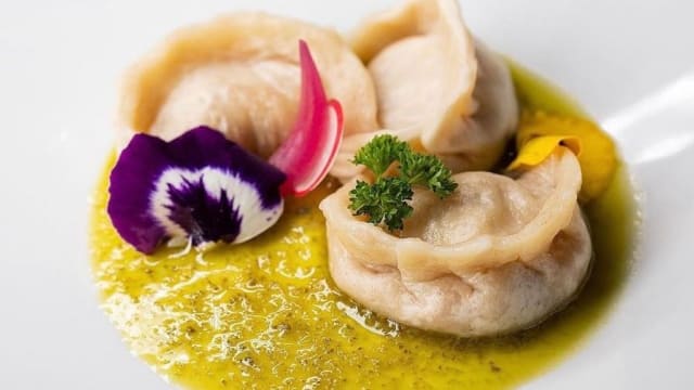 Tortello ripieno di crostacei su crema di datterini gialli, burrata e gambero rosso di Mazara