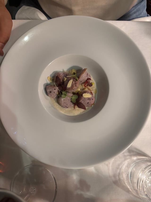 Gnocchetti viola, ricotta di bufala, pomodorini confit e oratella alla piastra