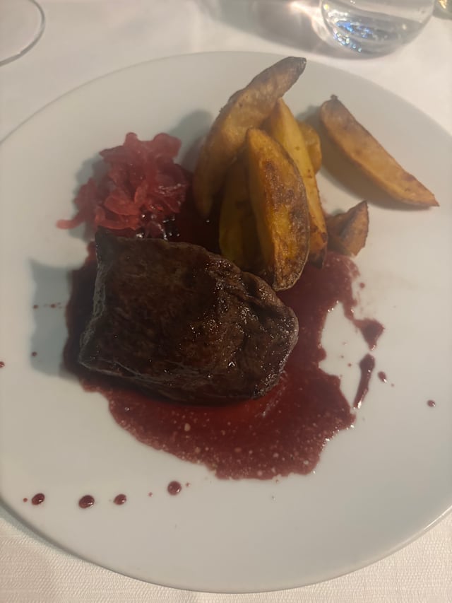 Tomawhok di maialino nero, salsa alla senape, cipolle rosse e patate al forno (250 g)