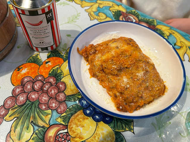 - Porchetta, berenjenas en aceite y queso pecorino. Bocadillos italianos con pan de focaccia artesanal acompañados con chips de patatas.