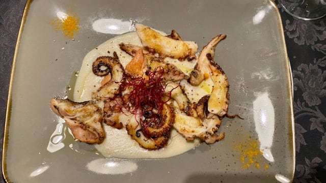 Polpo grigliato su fonduta al parmigiano e salsa verde