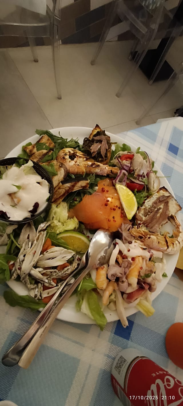 Insalala di mare, alici con rucola e cipolla di tropea, salmone affumicato e mozzarella, sgombra marinato, ruschette con rape e alici del cantabrico, gamberi alla griglia, spada alla griglia