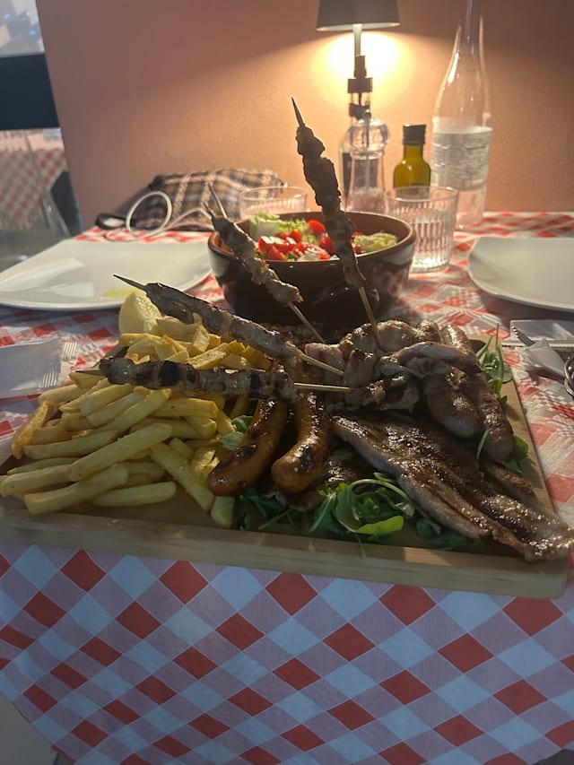 - Insalala di mare, alici con rucola e cipolla di tropea, salmone affumicato e mozzarella, sgombra marinato, ruschette con rape e alici del cantabrico, gamberi alla griglia, spada alla griglia