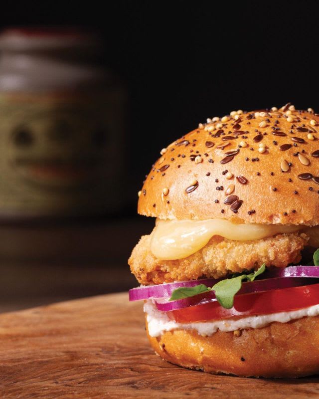 - Croustillant de dinde plein-filet VF, tranche de cheddar fumé, salade, tomate, oignon rouge et crème d’oignons grillés. Servi avec des frites.