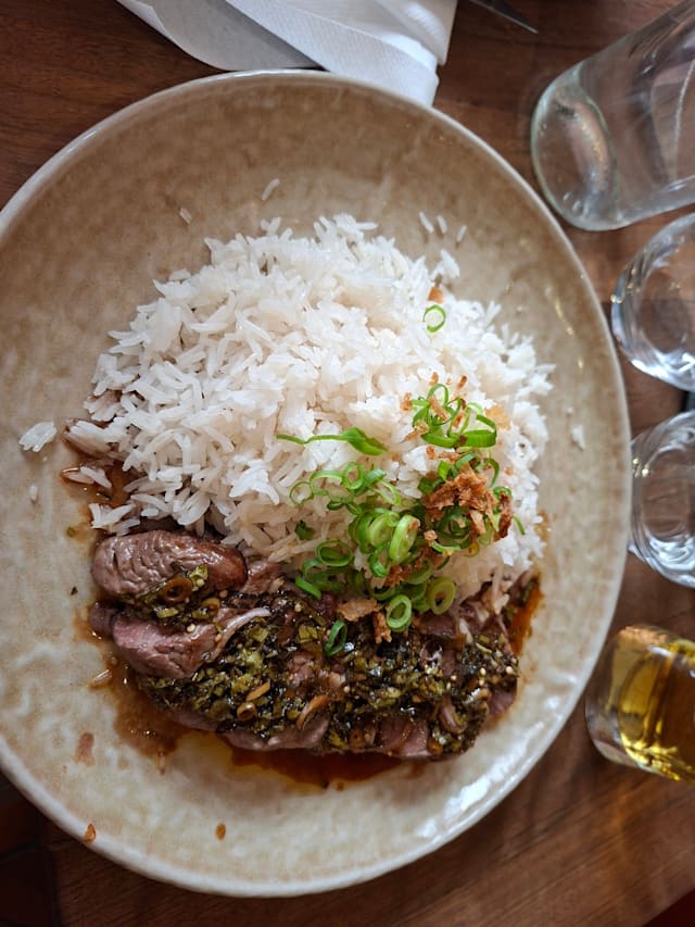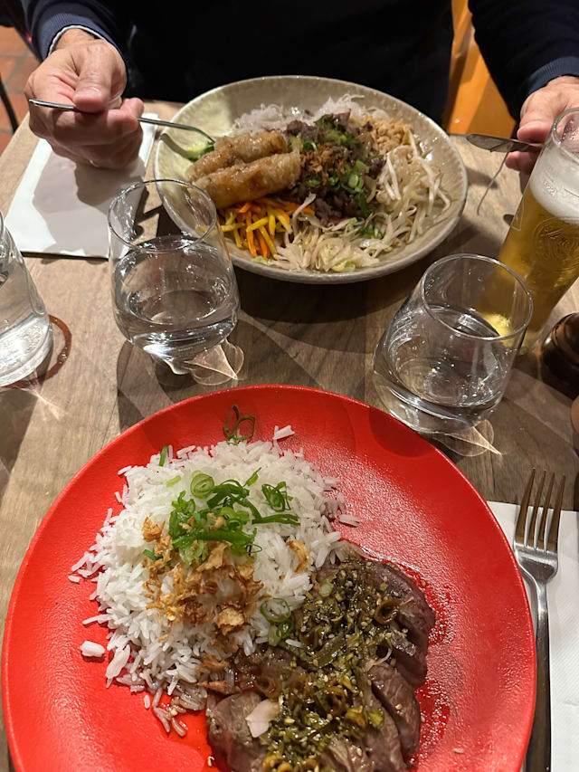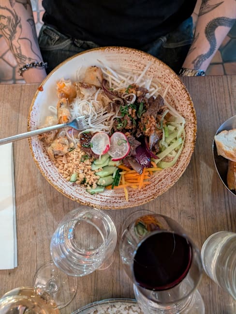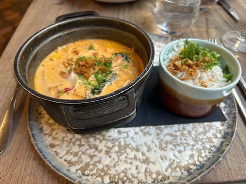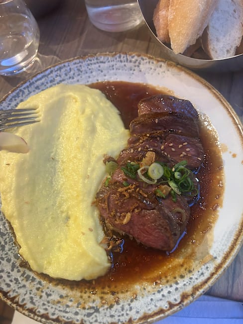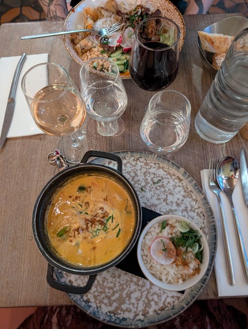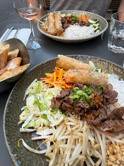 10/10We were staying around the corner, in my favorite neighborhood of St. Germain, and booked a reservation for our last night in Paris. We were so delighted with the food, French with a decidedly Asian spin. We started with the champagne x2 and a St. Germain spritz, easily the best version of the cocktail we've ever had! I had the shrimp ravioli in a broth which was warming and so flavorful. Next came a beef Bo Bun for me (Vietnamese noodle bowl) and my friends had the Salmon tataki and seafood Hot Pot. My friend declared this the best meal of our 9 night trip and I have to agree, it was in my top 3. Such a great find, and it's in a street/neighborhood filled with other cute bars and restaurants to go to before or after.