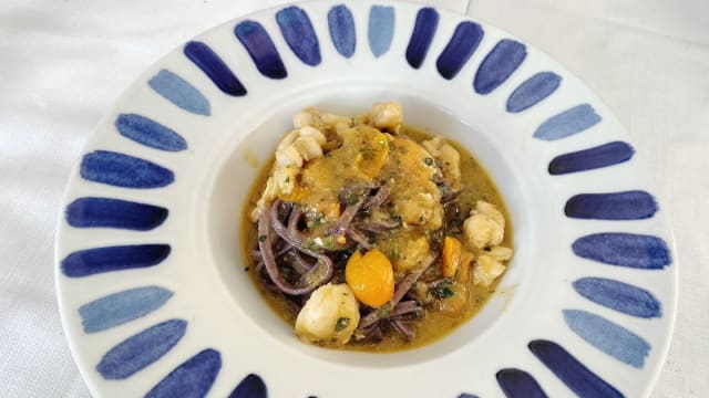Tagliolino al mirtillo con coda di rospo e bottatga con datterino giallo