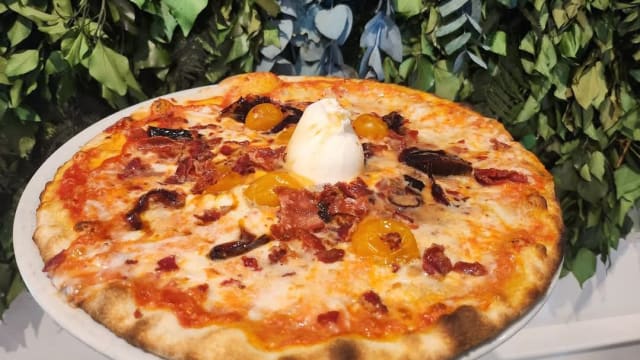 (Bianca: bufala, tentacoli di polpo, mandorle tostate, pomodoro ciliegino, olio al limone e prezzemolo)