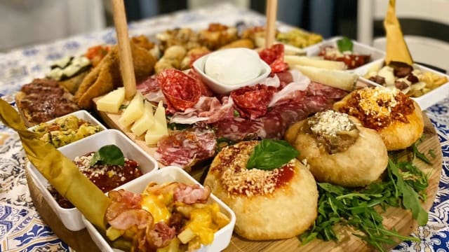 - 3 Frittatine classiche, 3 bruschette al pomodoro, 3 bao salsiccia e friarielli, 3 cocottine di gateaux ai friarielli, 3 cocottine di fagioli alla messicana, 3 cocottine di parmigiana della casa, culaccia di agerola del salumificio ruocco, capocollo di martinafranca, salame napoli del salumificio ruocco, salame spagnolo al pepe nero, caciotta al peperoncino, caciotta paglia e fieno, caciotta alle olive, mozzarella di bufala campana DOP