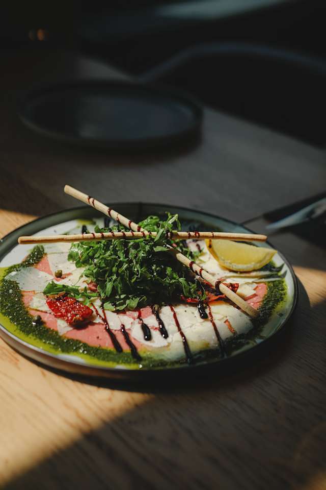 - Carpaccio, burrata crémeuse, pesto, roquette, câpres, tomates séchées, parmesan.