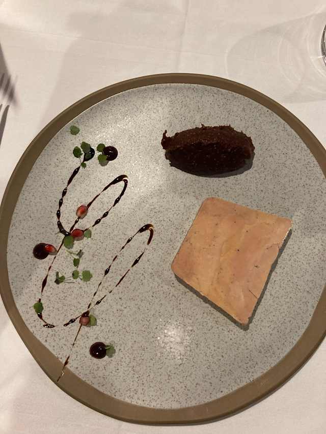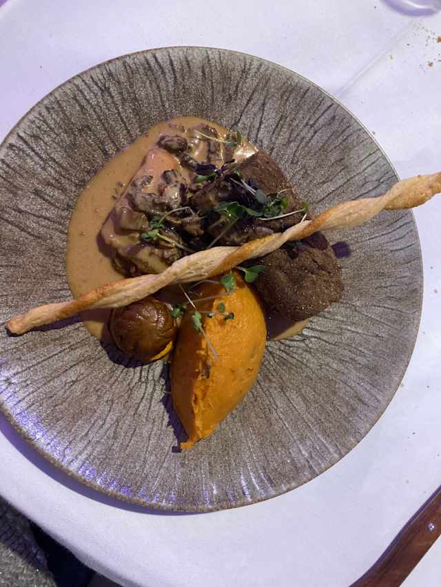 - Sauce échalote et épices douces, mousseline de céleri rave et pain perdue au lard fumé