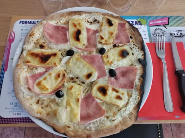- Crème fraiche, jambon cuit, oignons, fromage à raclette, olives