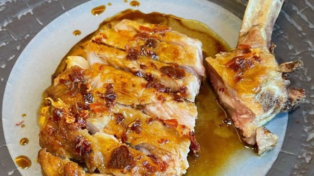 Arrosto di vitello 350 gr. servito con prosciutto di langhirano croccante, salsa di carne al vino bianco e jus di maiale (tempo di attesa 30 minuti)