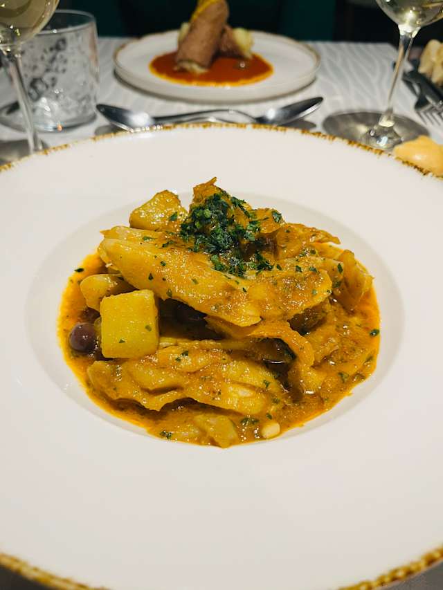 - Pescato del giorno in crosta di mandorle con caponatina alla siciliana