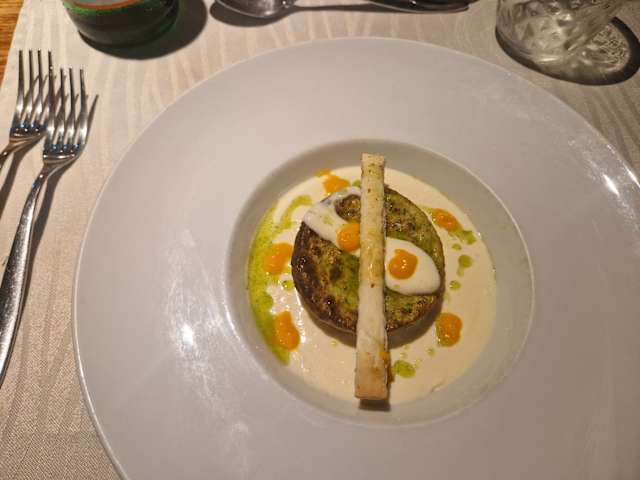 - su fonduta di parmigiano reggiano stagionato 36 mesi al profumo di maggiorana, la sua cialda e petali di guanciale croccante