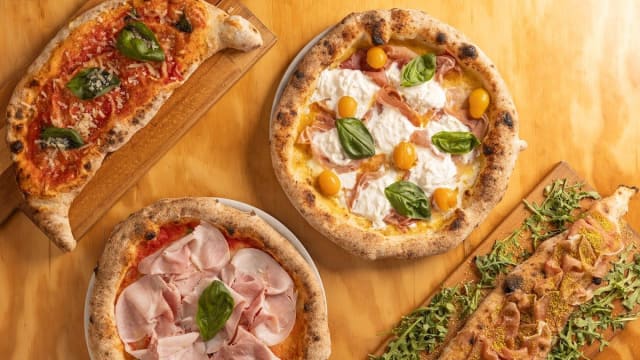 Passata di pomodori san marzano, mozzarella fior di latte, prosciutto cotto alta qualità, carciofi saltati in padella, funghi freschi, olive nere, wurstel