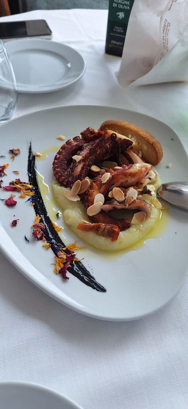 Polpo arrosto su crema di patate al rosmarino, pomodori secchi e mandorle tostate