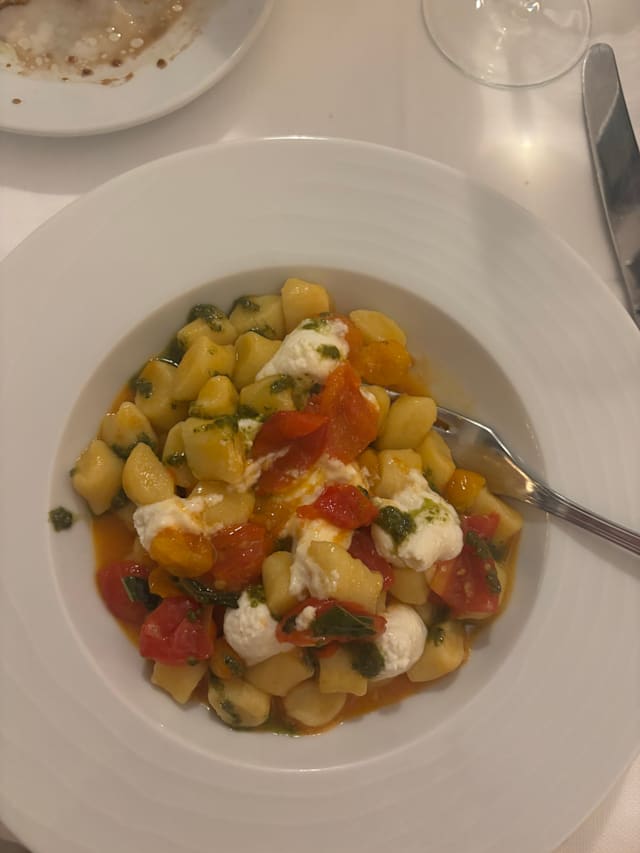 Gnocco di patate alla caprese con stracciata di bufala, pomodorini e pesto al basilico
