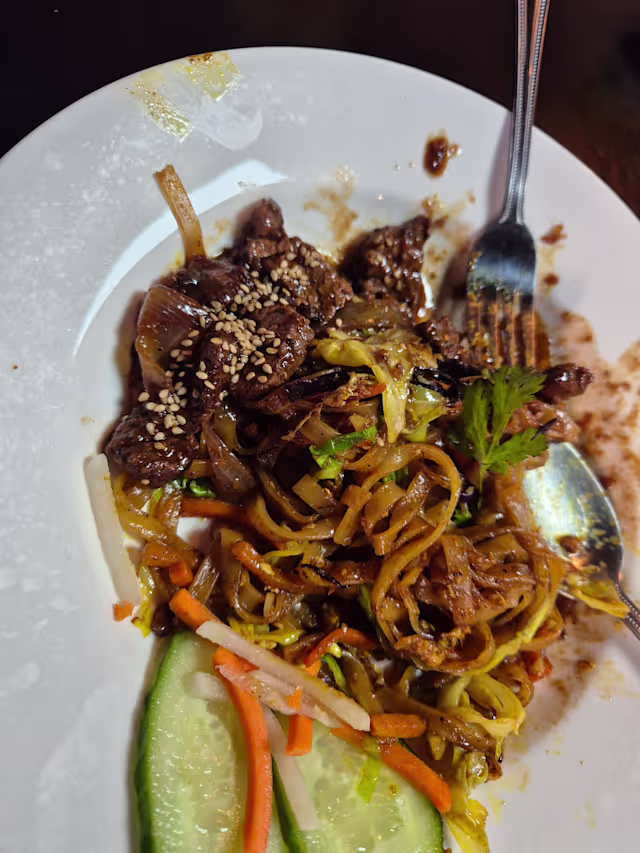 - Rice noodle soup topped with mixed beef, corriander, bean sprout, chilly and fresh lime