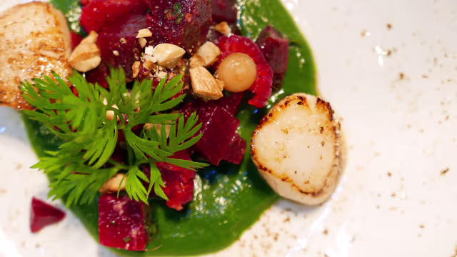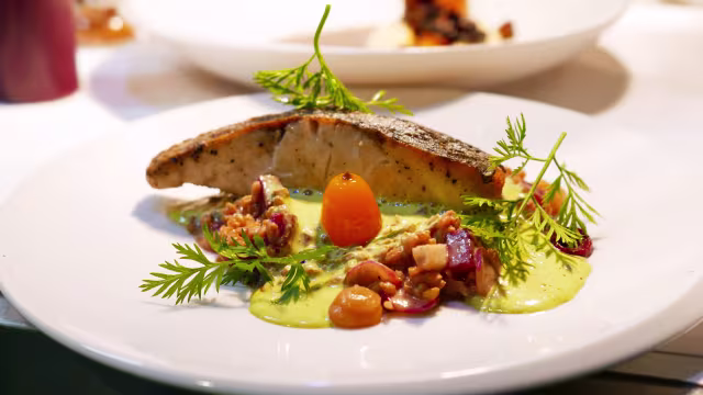 - Dorade Sébaste au four, creme de courgettes, sauce pesto rosso, légumes de saison