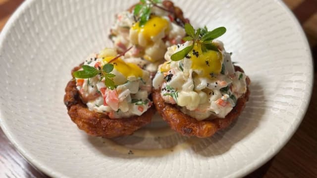 Masa suave de papa, rellena de aguacate, acompañada con nuestro delicioso ceviche la caleta
