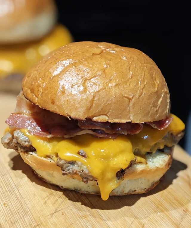 - Doble smash de 90gr amb ceba caramel·litzada, melmelada de bacó, formatge fumat amb cruixent de morros