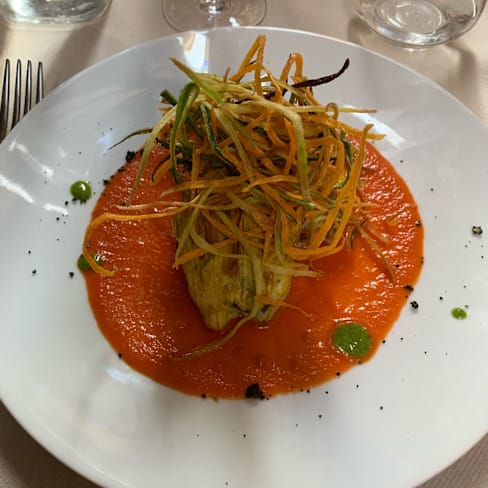 9.5/10+1Regional plates with a modern touch. Amazing both starters: stuffed zucchini flowers and the classic branda. Maccheroncini in shrimp and pistachio pesto “da leccarsi i baffi”. Great service. A pity due to circumstances they could not serve more tables and let few people go.