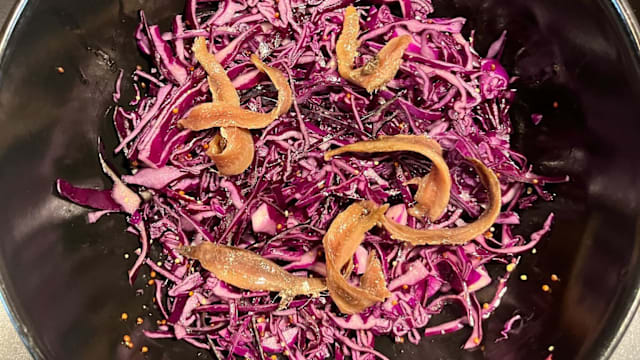 - Cavolo viola, carote croccanti, ceci, tonno. Paste sono mantecate con grana padano DOP