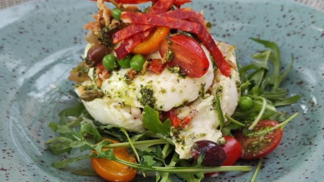- Tomates, burrata 125gr, jambon cru, oignions rouge, roquette, olives, basilic
