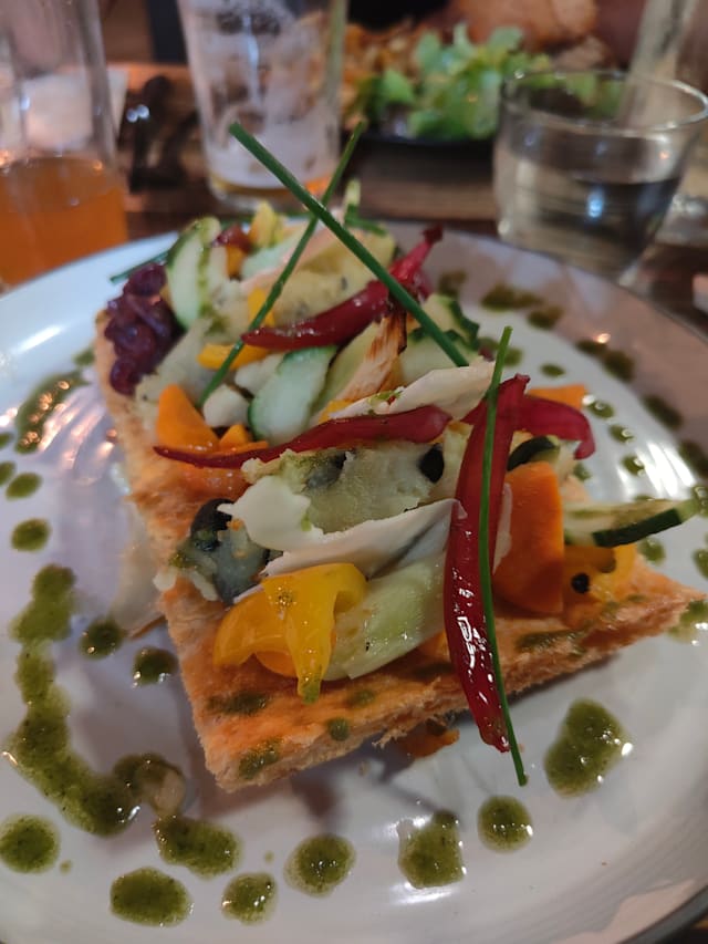 Bun boulanger, brie pané doré, légumes d’été grillés, chutney de tomate, mayonnaise, jeunes pousses, pickles