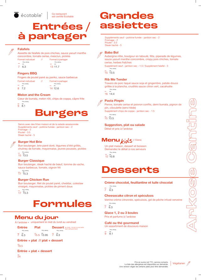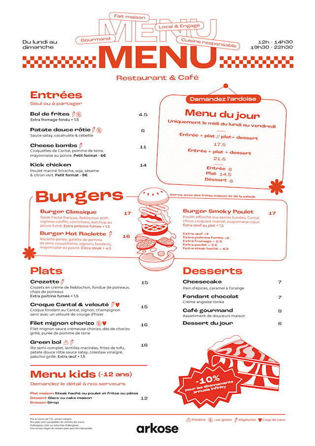 Une table où on se fait plaisir, that’s the plan ! Des plats simples, des recettes pimpées, des burgers à se damner et des desserts auxquels on ne peut pas dire non même si on est full, voilà ce qui vous attend chez Arkose Cantine.