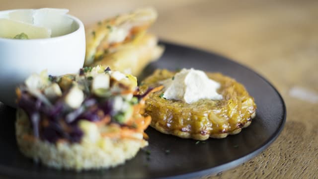Assiette de falafels de pois chiches, sauce yaourt menthe concombre, tomate cerise, mesclun, pickles