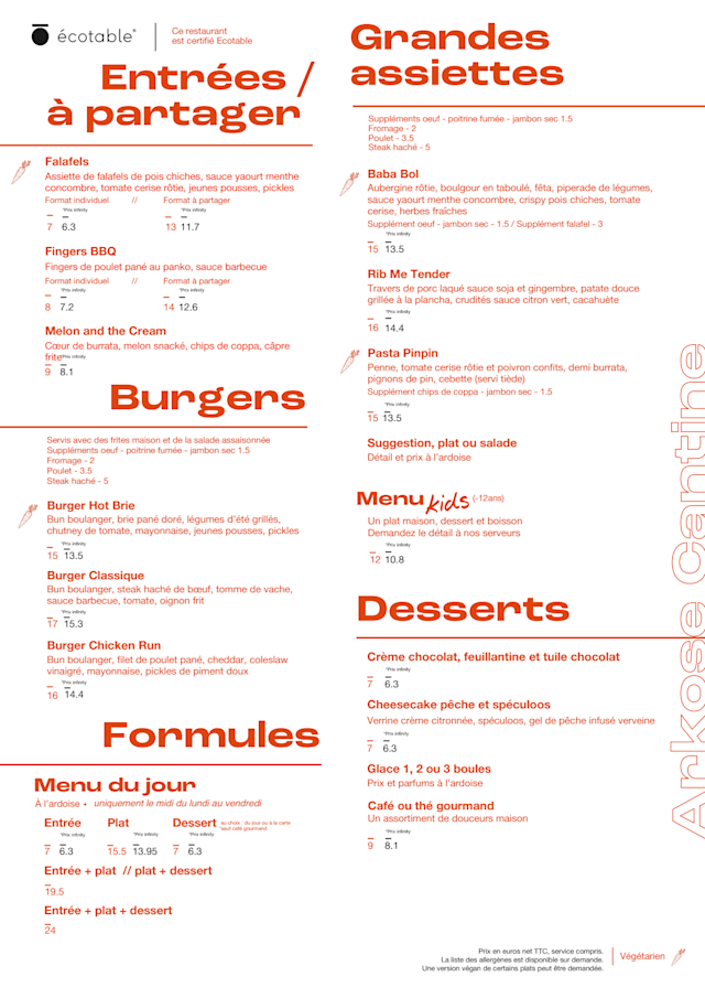 Une table où on se fait plaisir, that’s the plan ! Des plats simples, des recettes pimpées, des burgers à se damner et des desserts auxquels on ne peut pas dire non même si on est full, voilà ce qui vous attend chez Arkose Cantine. Ici, pas de compromis, la règle c’est de saison et local ! Végétari...