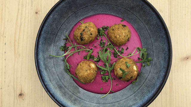 Trio de quinoa pilaf aux petits légumes, halloumi frit, butternut rôti au sirop d'érable et thym, sauce yaourt, chips de topinambour, pickles, jeunes pousses, vinaigrette moutarde