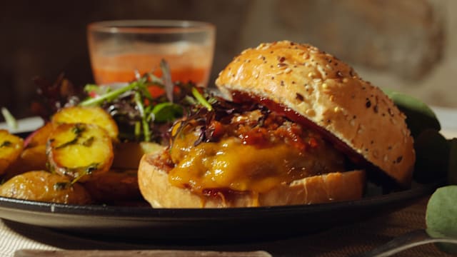 Bun boulanger, poulet mariné, cheddar, mayonnaise sriracha, coleslaw de saison sésame citron vert, pickles