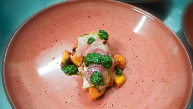 Crespella ripiena di ricotta, asparagi e guanciale su salsa di pomodoro e peperoni