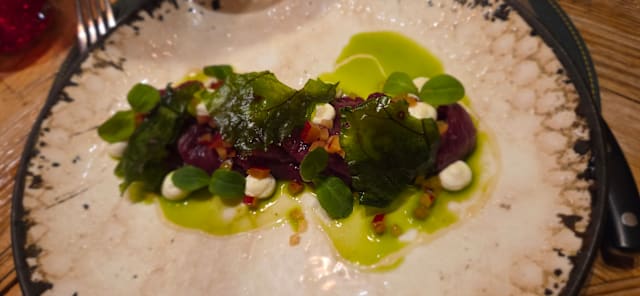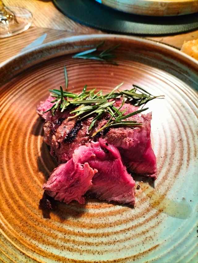 Cervo alla brace, pure al cipresso , nocciole e lamponi