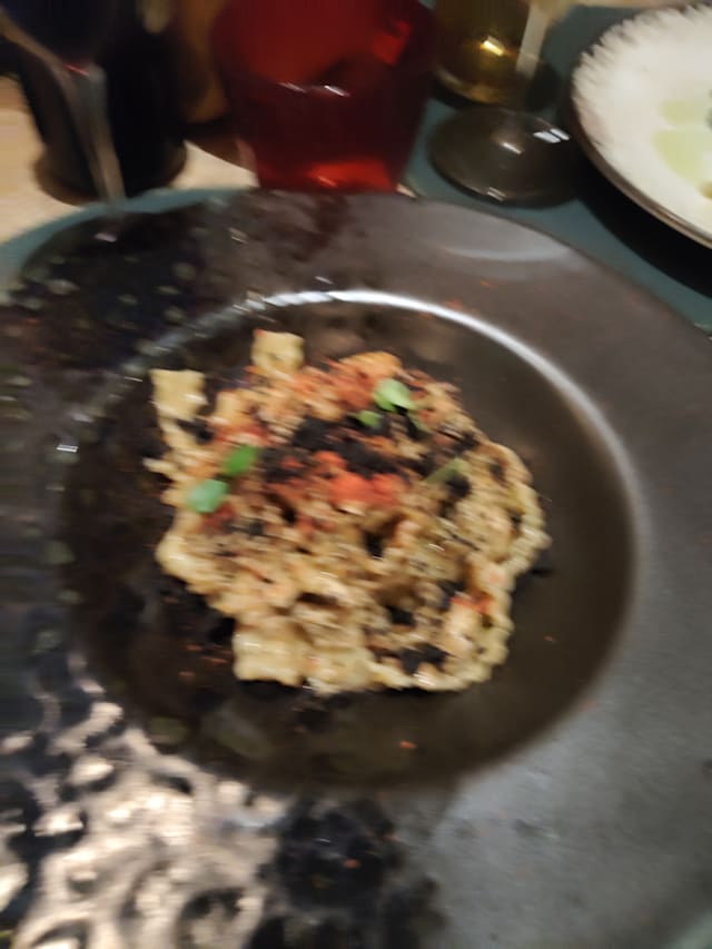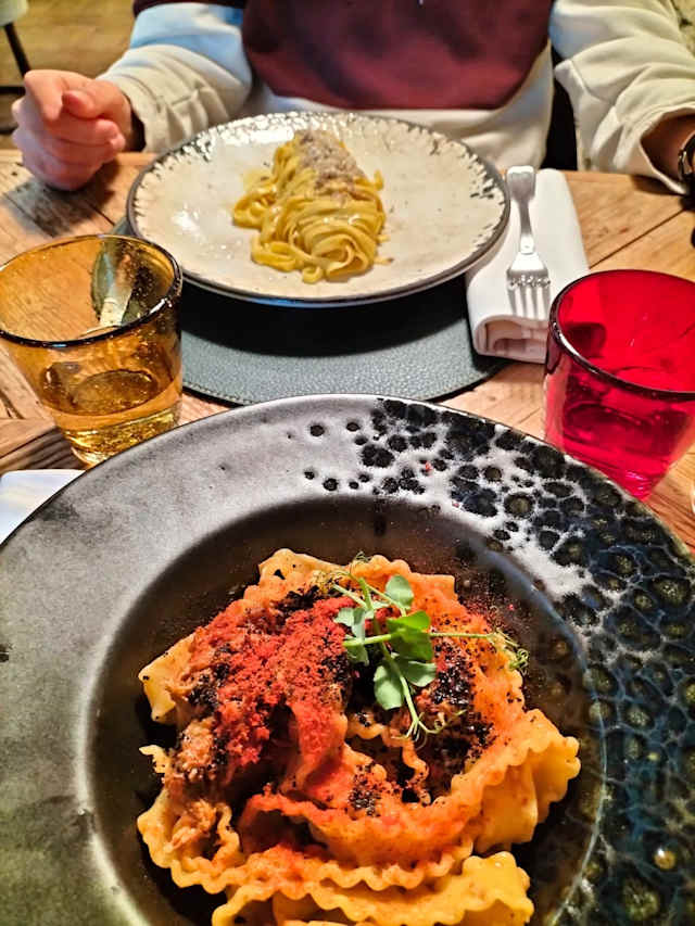 Reginette al ragu' di faraona, crumble di olive e olvere di pomodoro