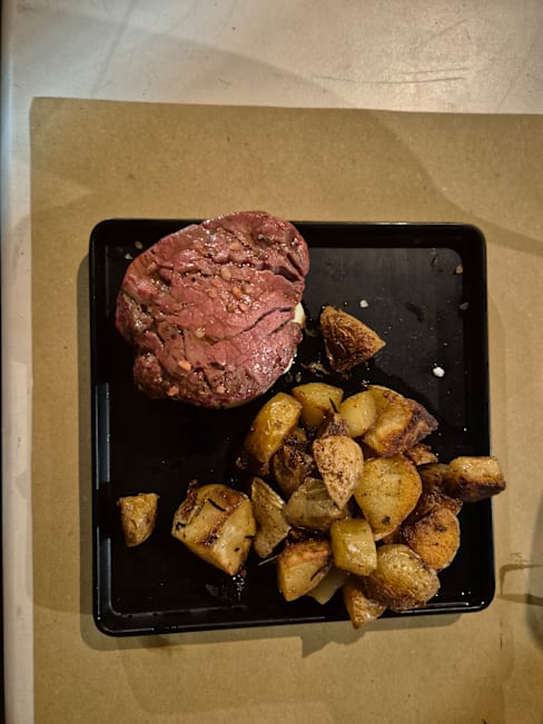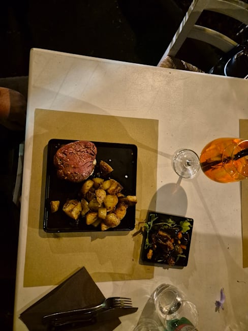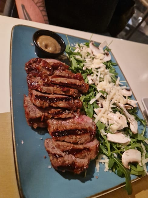 4/10We ordered 2 entrecôtes, both medium-well. Both came out very dry and chewy, and one out of the two with lots of tendons and fat. We complained and they took the food back to the kitchen but they didn’t make any new. They argued they were out of meat (all on the menu) so we ordered a pizza (nduja) and chicken dish instead. The pizza was average, nothing extraordinary. The chicken dish was just a boring chicken salad. This place is not worth a visit!