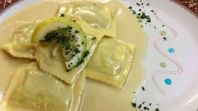 Pasta fresca con farina e uova, ripiena di ricotta e spinaci. Serviti con una delicata salsa a base di panna, burro, succo di limoni freschi e scorza grattugiata, un pizzico di sale e qualche goccia di brandy italiano, che aggiunge una nota calda e profumata.