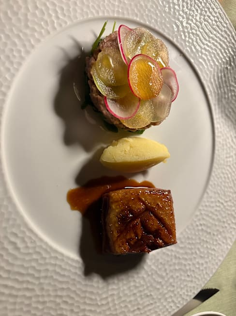 9/10The outdoor patio was lovely at night. The food was presented beautifully. I had Cod and a side of vegetables. I would have liked to see a more extensive menu.