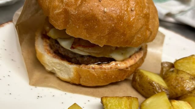 Bun artigianale, hamburger, caciocavallo affumicato, pancetta croccante, pomodorino confit e mayo al crusco