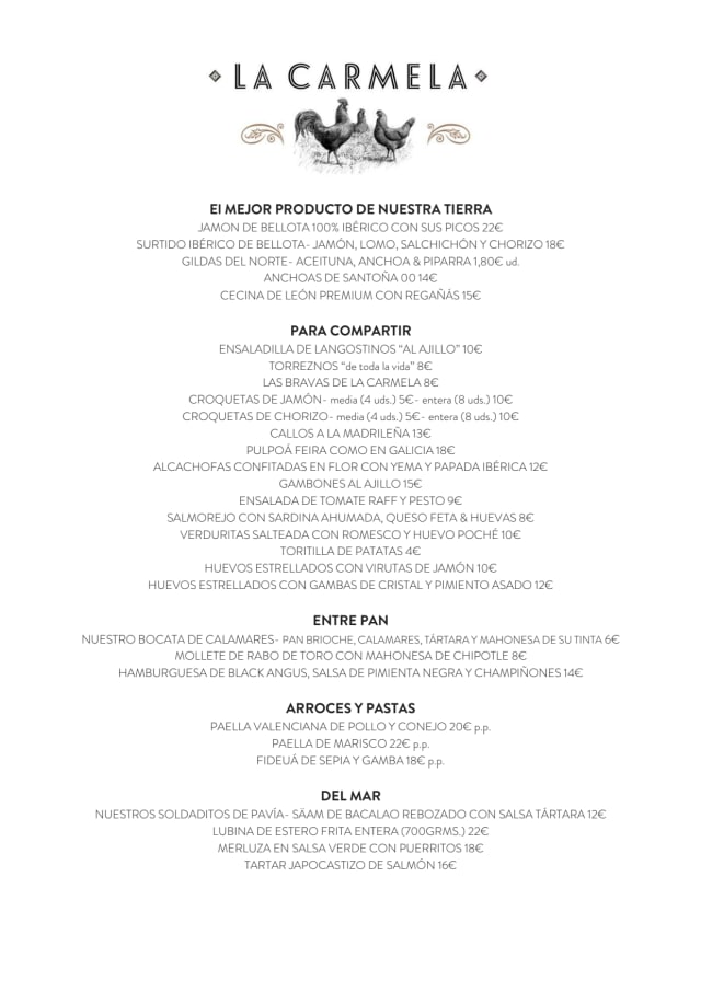 2/10When we arrived at La Carmela, we were left to wait although we had a reservation. The place was packed with people and seems that the restaurant was overbooked. After 20mins waiting we left, afraid that to order and actually eat was also going to take long. Very disappointed as I had booked way in advance.