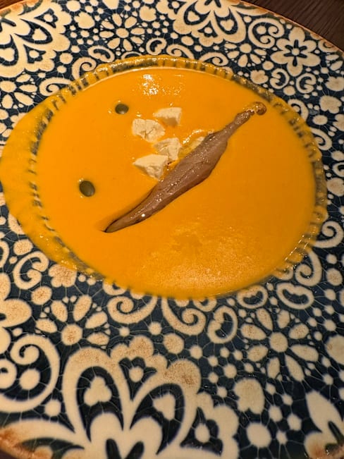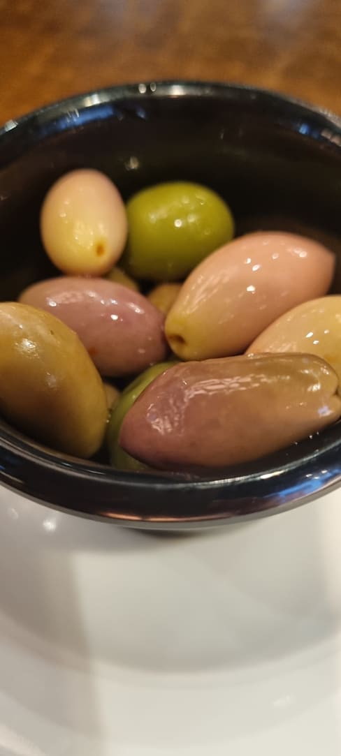 9.5/10Cold tomato soup with smoked sardine worked well. Super crispy pork rinds. Great green olives. Cheesecake went well with sweet moscatel wine.