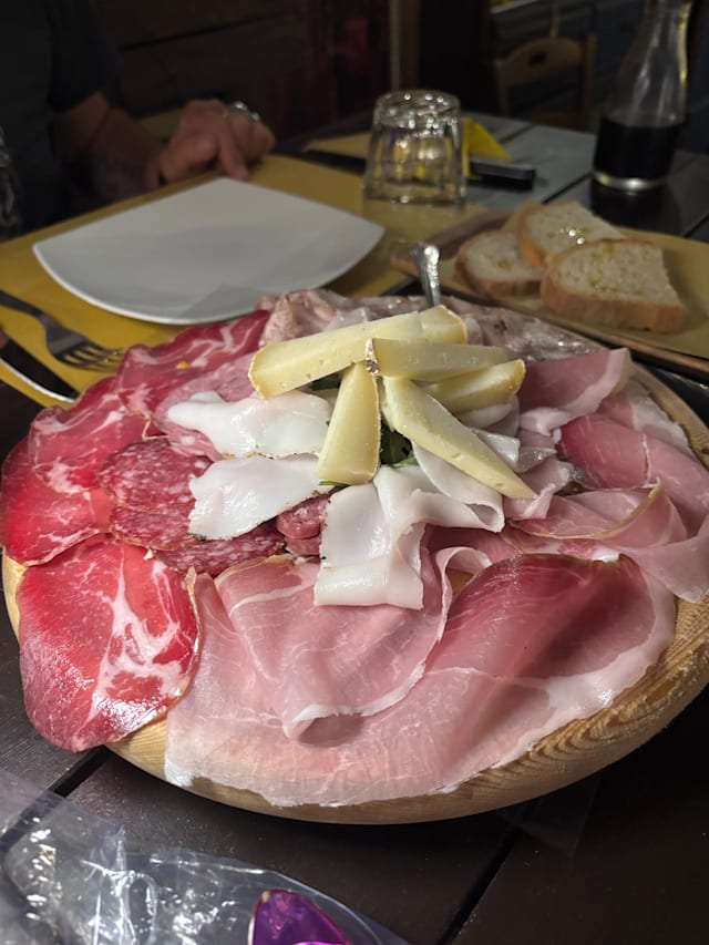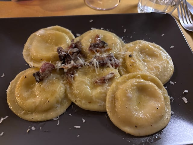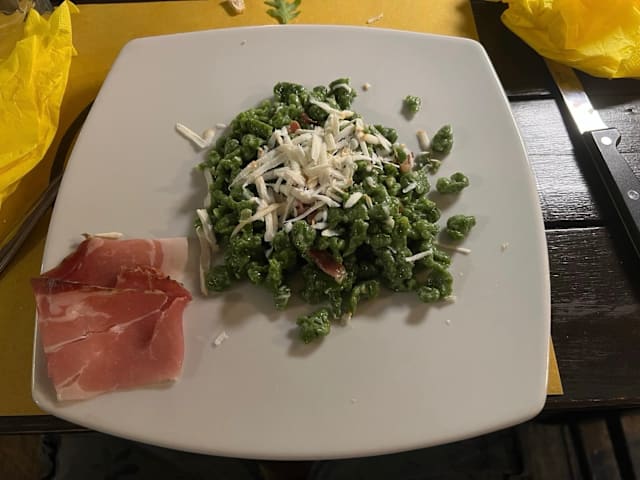 gnocchetti acqua, farina e spinaci, noce di burro di malga e speck della Val Pusteria, serviti con ricotta affumicata